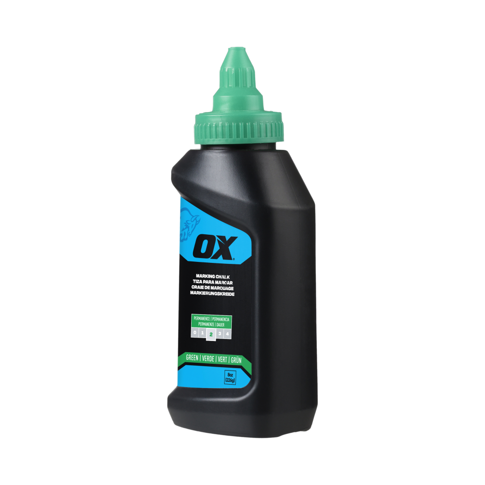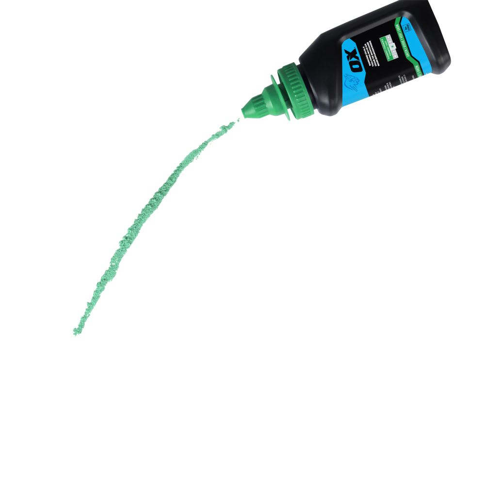 Designed for use in framing, layout work, or corrections, the OX Hi-Visibility Green Marking Chalk ensures precise and durable results. Its compatibility with all OX chalk line reels and ability to handle various surfaces make it an essential tool for professionals. Trust OX for dependable, bright markings that help you get the job done with accuracy and efficiency.